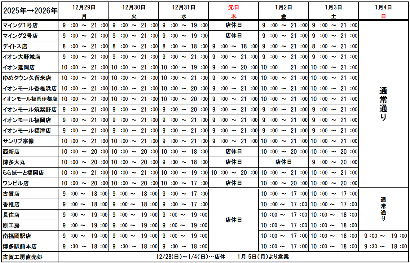 2025年~2026年 年末年始の営業時間及び元日休業店舗を下記の通りとさせていただきますのでお知らせいたします。