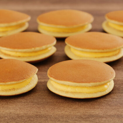 ふわふわで優しい甘さのどら焼の皮に、たまごたっぷりのカスタードをはさみました。