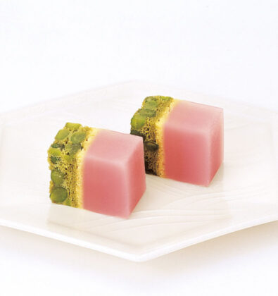 えんどう鹿の子入り抹茶浮島と黄身高麗、菖蒲色羊羹の合せものでございます。