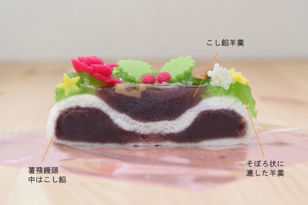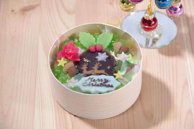 薯蕷饅頭(中はこし餡)に、和菓子で彩りを添えたクリスマスケーキをイメージした上生菓子です。