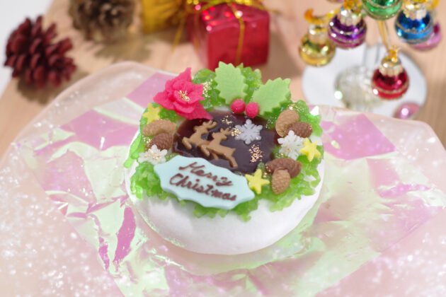 そぼろ状に漉した羊羹でクリスマスリースを…。リースの中には、錦玉で結氷を表現し、トナカイが贈り物を運ぶ聖なる夜空を描きました。